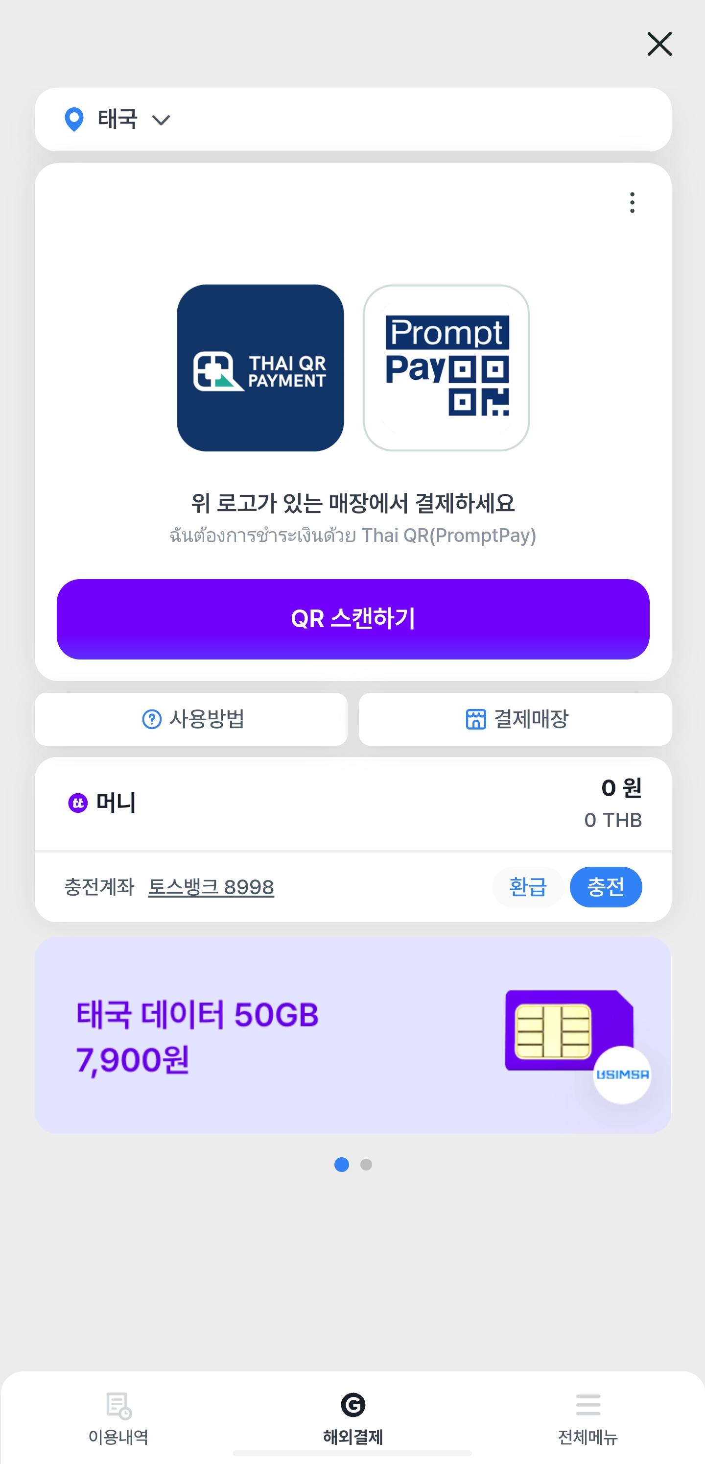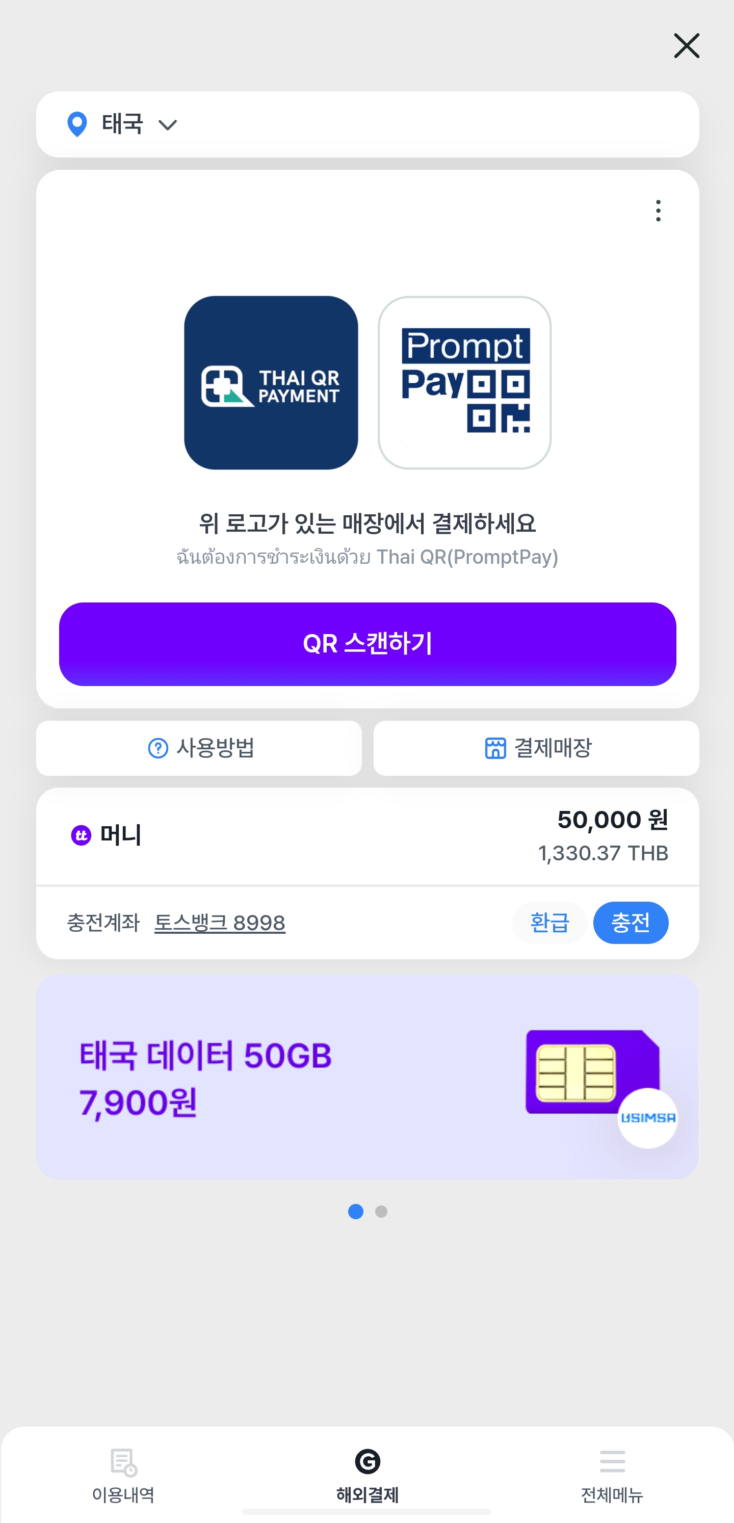 이렇게 5만원, 현재 환율로 약 1,330.37바트가 충전되었다.
