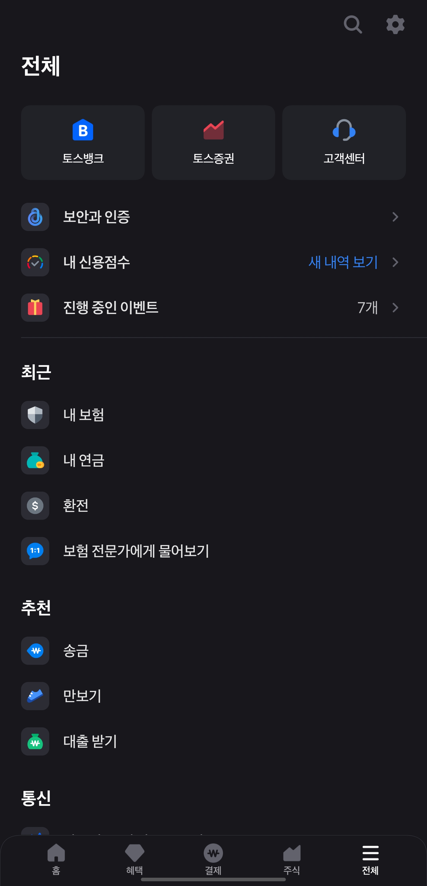 토스 앱 하단 메뉴에서 [전체] 선택,