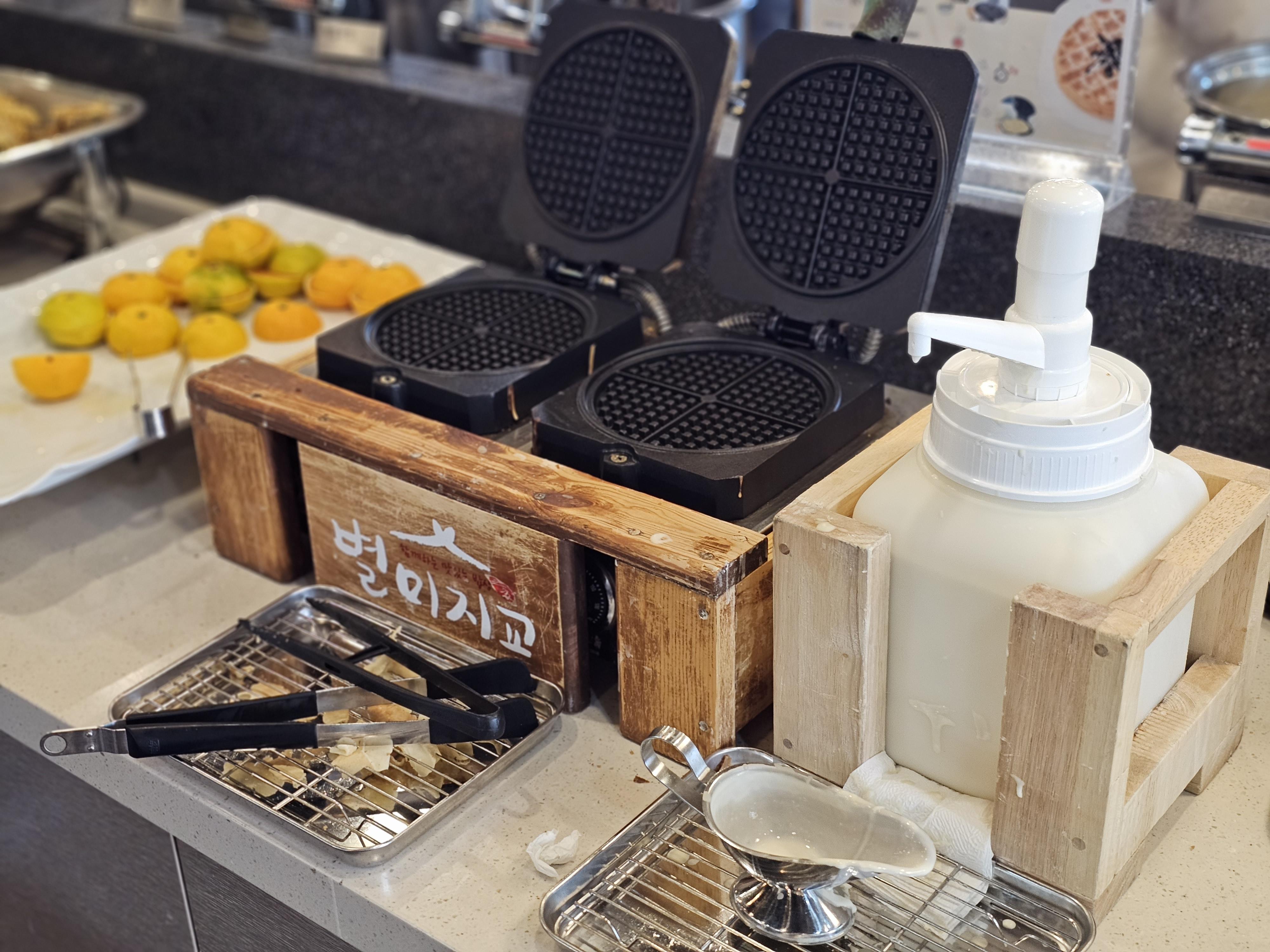 직접 구워서 먹을 수 있는 와플 기계와 과일