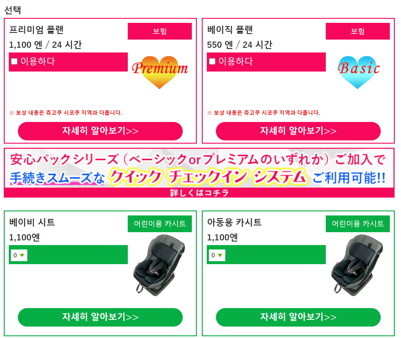 보험 및 카시트 대여 선택이 가능한 페이지도 보인다.