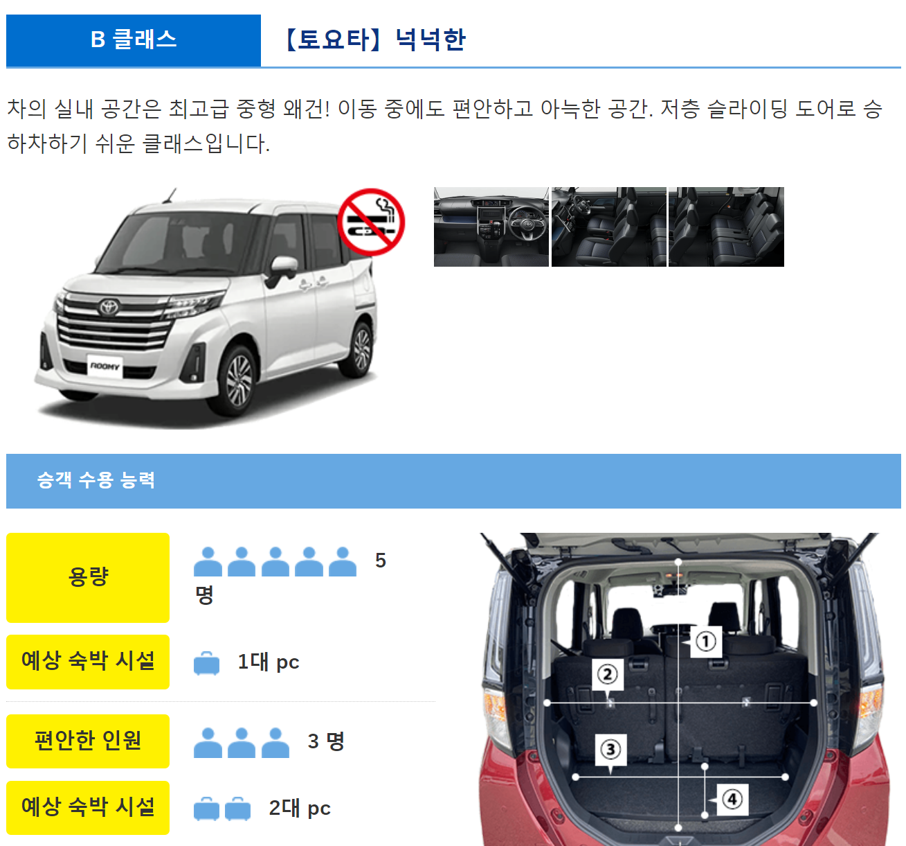 승객 수가 5명으로 되어 있으나, 5명이 타면 짐을 다 실을 수 없게 될 것이다... 2명이 적당하고 최대 4인까지 가능할 듯 하나