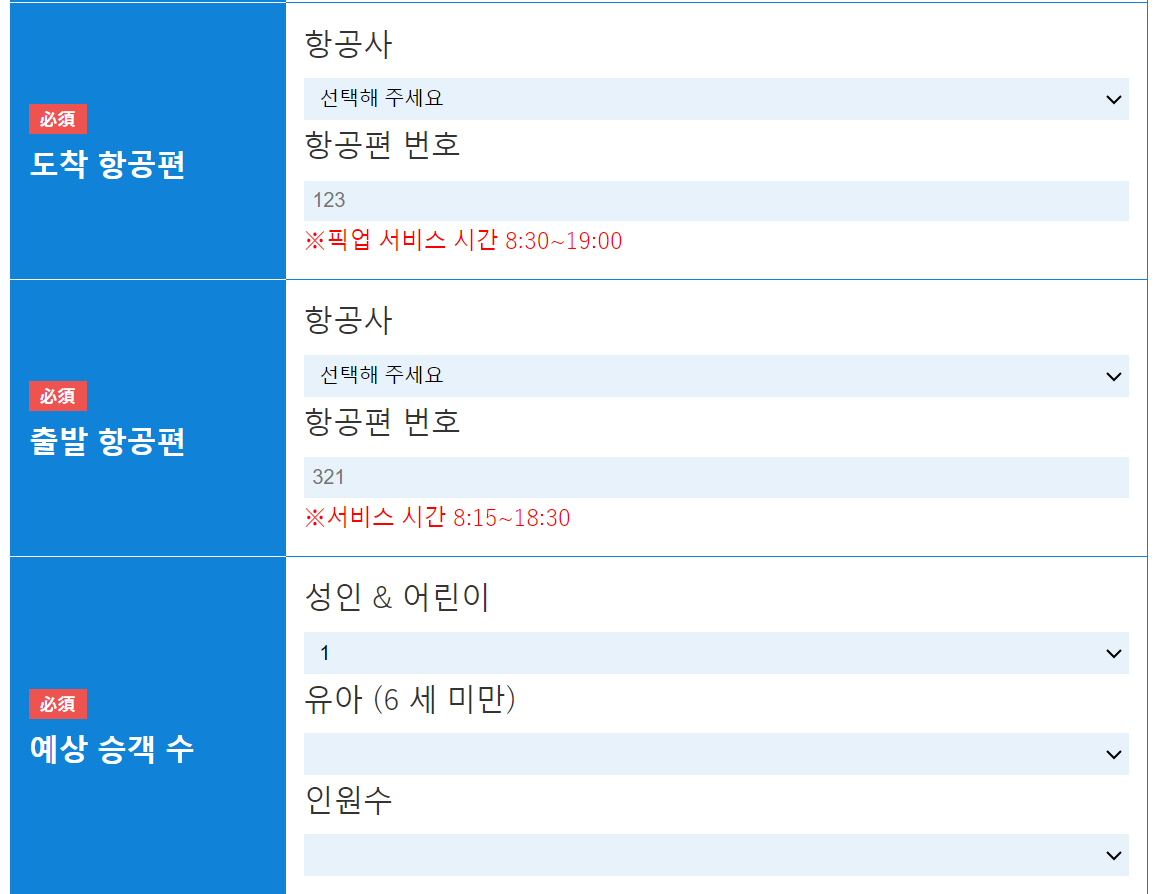 나하공항 무료 픽업을 선택해서 그런 건지, 도착/출발 항공편을 입력하게 되어 있다.