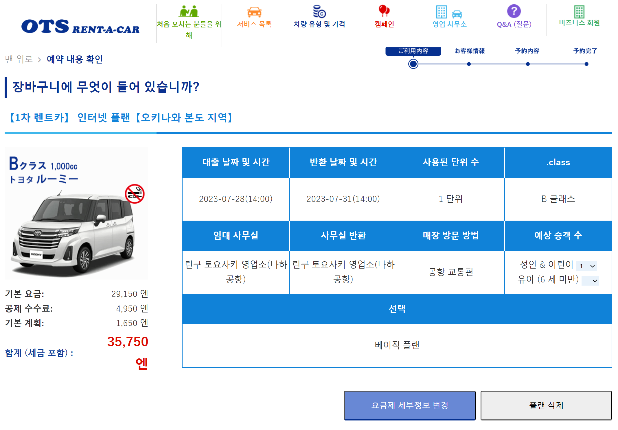 그러면 장바구니에 이렇게 선택한 차량과 옵션으로 예약 내역이 담기게 된다.